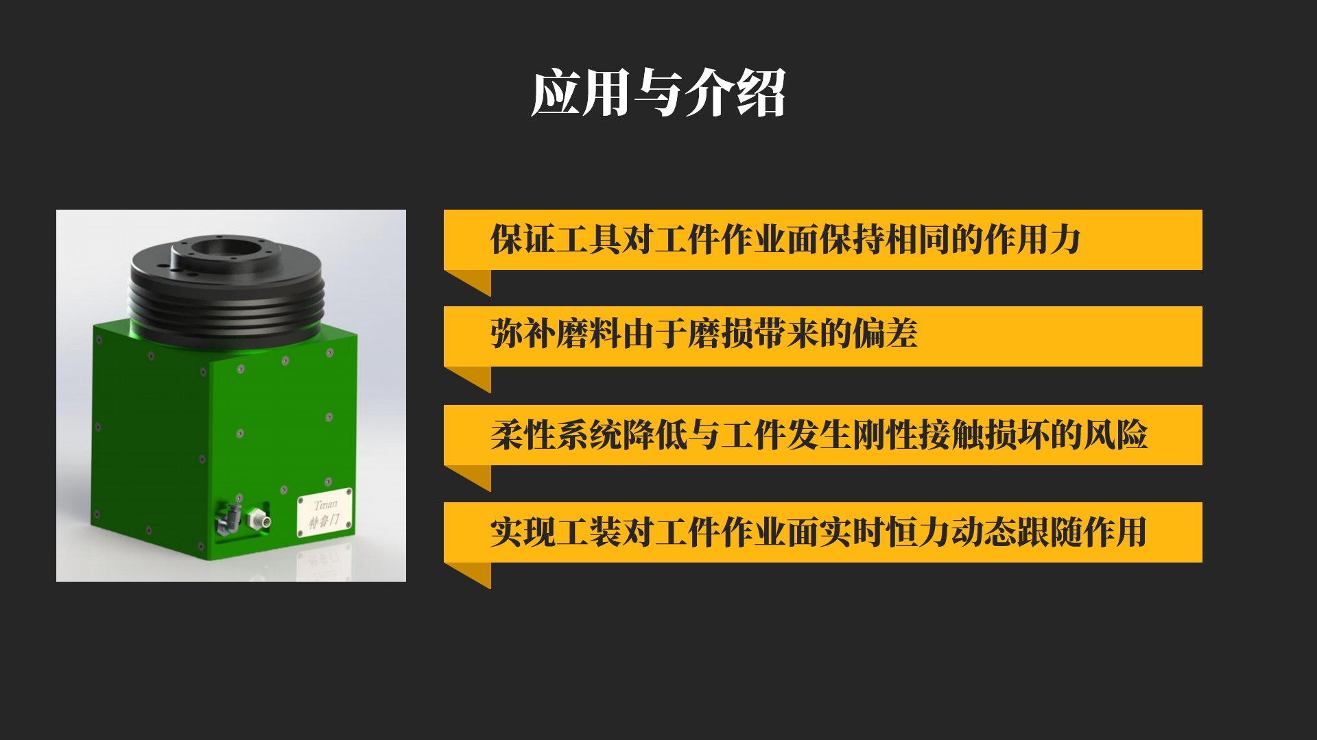 力控单元保证工具对工件作业面保持相同作用力;弥补磨料由于磨损带来的尺寸偏差;柔性系统,降低了机器人与工件发生刚性接触损坏的风险。