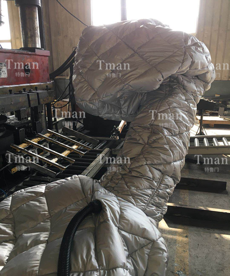在冷库和北方的冬季,零下三十度左右气温环境下,会导致机器人运行速度变慢,水管冻裂,机器润滑油凝固等现象,针对客户的需求,我司开发出可加热,可制冷的恒温机器人防护服,根据客户现场需求调整温度,保障客户在恶劣的环境中正常使用。