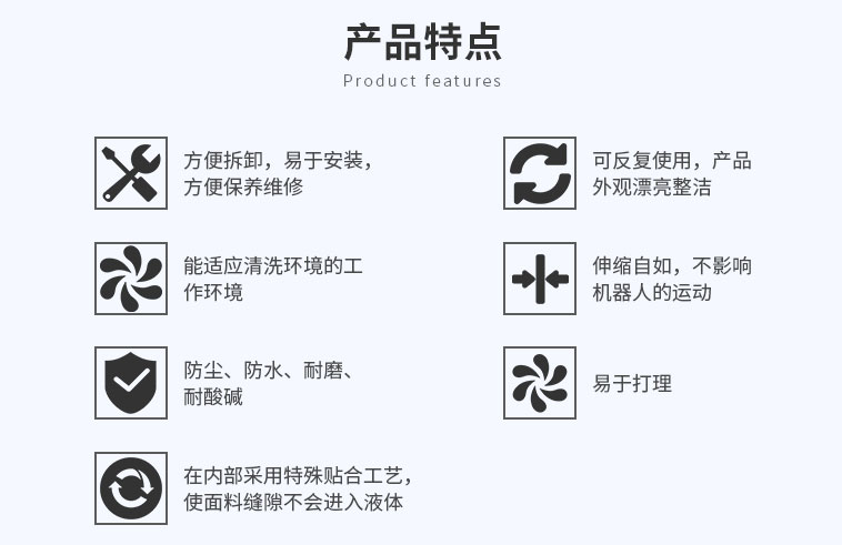 主要采用高韧性,高强度的材质,具有较强的耐酸碱,耐腐蚀性,能有效的保护机器人,延长使用寿命。
